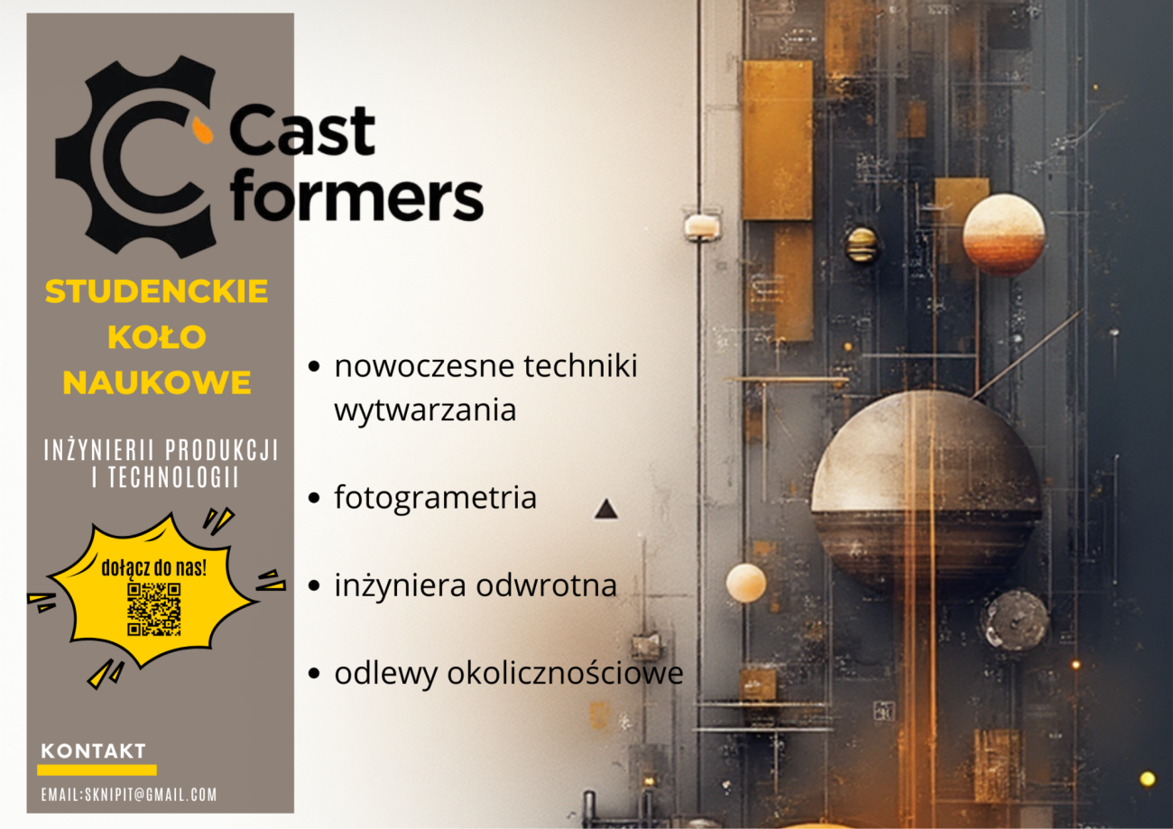 Z przyjemnością informujemy, że nasze koło naukowe wchodzi w nowy etap działalności. Od dnia 19.11.2025 r. dotychczasowa nazwa SKN Odlewnictwa i Przetwórstwa Tworzyw Sztucznych zostaje oficjalnie zmieniona na Studenckie Koło Naukowe Inżynierii Produkcji i Technologii Castformers.