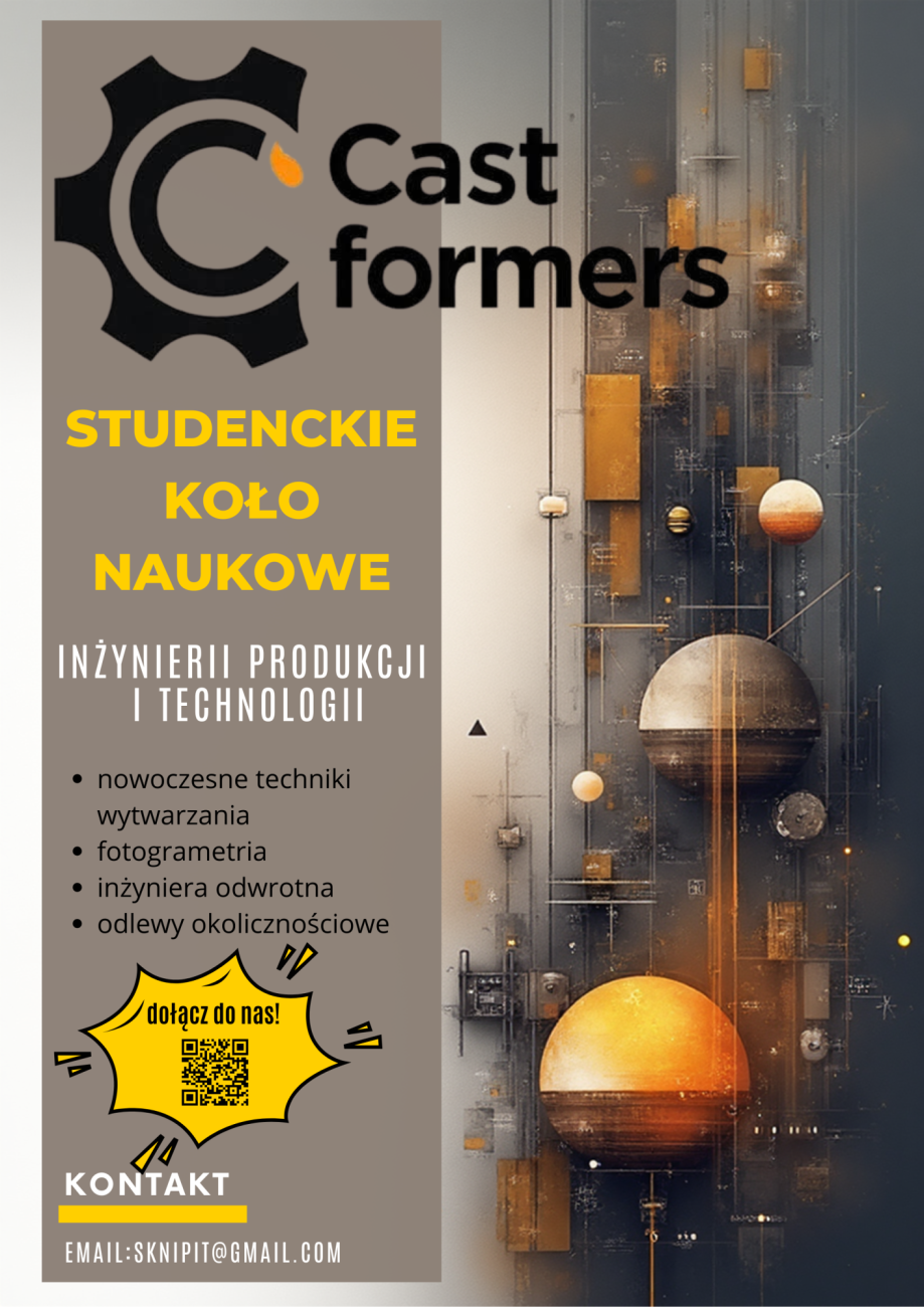 We are pleased to announce that our student research group is entering a new stage of its activity. As of November 19, 2025, the current name Student Research Group of Foundry and Plastics Processing (SKN Odlewnictwa i Przetwórstwa Tworzyw Sztucznych) will be officially changed to Student Research Group of Production Engineering and Technology Castformers (Studenckie Koło Naukowe Inżynierii Produkcji i Technologii Castformers).